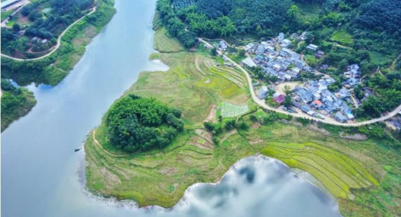 航拍益智乡石寨村全貌(11月19日摄) 石寨村是益智乡政府和集镇的所在地,地理位置独特,东面连接糯扎渡水电站库区,西面连接威远江省级自然保护区,既是以傣族为主的非贫困村,又是民族团结建设示范点,伴随着乡村治理步伐的加快,石寨村迎来了翻天覆地的变化。