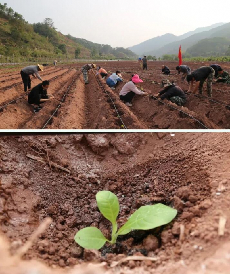 活动现场,有的精心挑选适合移栽的烟苗,放在塘前;有的则用细棍,在塘内戳出一个小洞,小心翼翼地把烟苗栽到洞中,再轻轻拨动苗周围的土,让小苗能够“挺直腰板”。最后,对移栽好的烟苗进行施药、覆膜、留孔,就可以让苗在膜下“休息”10天左右,静静生长。在三个党支部的共同努力下,共完成约5亩6000余株的烤烟苗移栽。