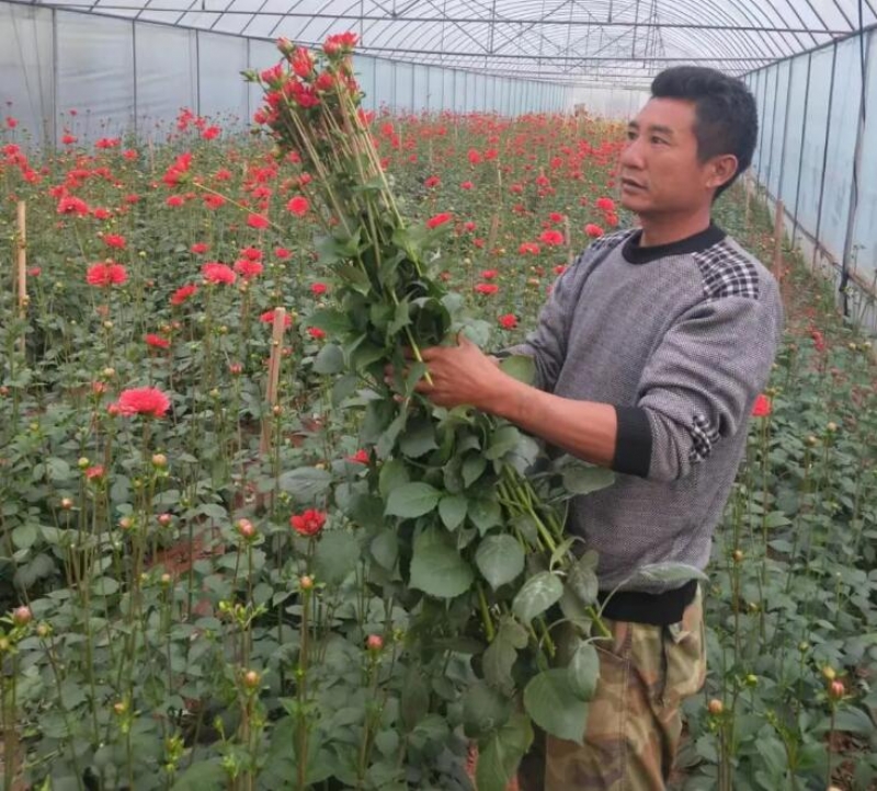 永平镇常顺养殖专业合作社负责人黄斯梅介绍:此前尝试过种植石解、白芨、重楼等中药材,产业效益均不明显。直到2018年8月,在花卉所合作企业“云南我种花农业科技有限公司”的引荐下,他们6个合伙人向迁营村迁东小组租地65亩,建了84个简易大棚,专业种植花卉所自主知识产权大丽花切花品种“紫霞”和“粉黛”,以及夜来香、翠珠、姜荷花、洋甘菊、尤加利部分特色品种。大丽花单品价格稳定需求量大,效益最好,每亩最高收入达10万元。因大丽花多年生常年采摘特性,在新冠肺炎疫情期间虽也受影响,但不像一茬采摘的花卉品类那样影响严重,抵御风险能力相对较强。