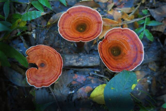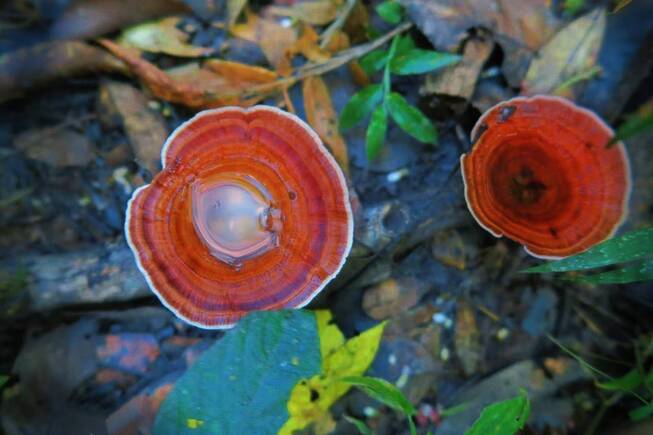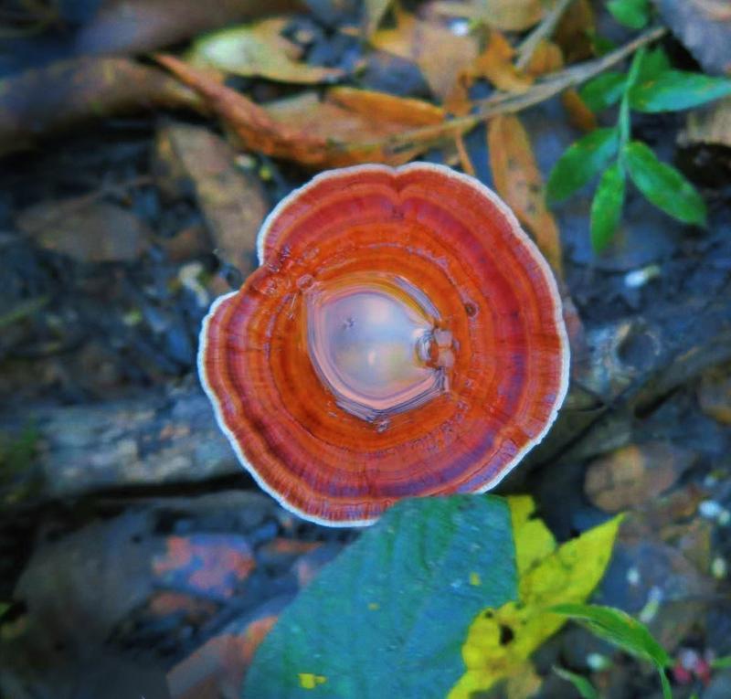 在威远江省级自然保护区的腐叶林间,巡护镜头定格了一群“红釉玉盘”的悠然身影——野生灵芝正舒展着带环纹的菌盖,嵌在松针与朽木织就的软毯上。