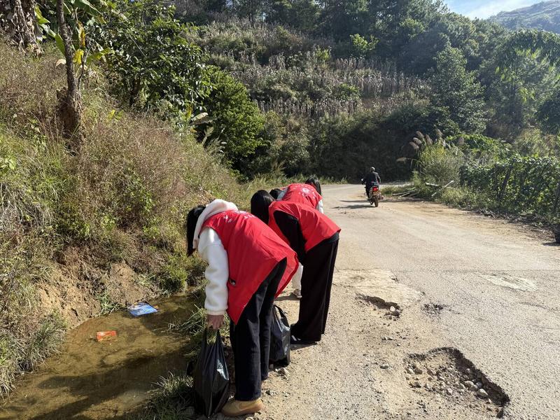 活动当日,志愿者们身着统一红马甲,携带铁钳、垃圾袋等清洁工具迅速集结,按照“分片包干、责任到人”的原则,奔赴各村组展开清洁行动。重点对村内主干道、沟渠岸边、闲置地块等易堆积垃圾区域进行全面清理,针对白色塑料袋、废弃包装物、枯枝败叶及废旧农具等各类杂物,志愿者们弯腰俯身、细致排查,做到“发现一处、清理一处、干净一处”,确保不留卫生死角。