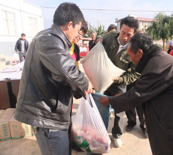 1月12日上午,在民乐镇到移民安置点开展慰问活动,共为36户移民发放42床被子, 3425千克大米,向移民群众送去了党和政府的关怀和新春的祝福。(郭守琴)