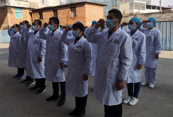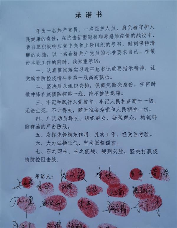 仪式上,共产党员突击队全体队员面向党旗,重温入党誓词,庄严宣誓。随后,党员们积极踊跃请战,争相在党员抗击疫情承诺书上签字留印:“作为一名共产党员、一名医护人员,肩负着守护人民健康的责任,在抗击新型冠状病毒感染疫情的战役中,我自愿积极响应党中央和上级组织的号召,时刻保持清醒的头脑,以一名合格共产党员的标准要求自己,在做好本职工作的同时,我郑重承诺:一、认真贯彻落实习近平总书记重要指示精神,让党旗在防控疫情斗争第一线高高飘扬。二、坚决服从组织安排,佩戴党徽亮身份,任何时候冲锋在疫情防控第一线,绝不推诿退缩。三、牢记和践行入党誓言,牢记人民利益高于一切,无论生死,不急得失,随时准备为党和人民牺牲一切。四、广泛动员群众、组织群众、凝聚群众,构筑群防群治的严密防线。五、发挥先锋模范作用,扎实工作,经受住考验。六、大力弘扬正气,坚决抵制谣言。七、召之即来、来之能战、战则必胜,坚决打赢疫情防控阻击战。”