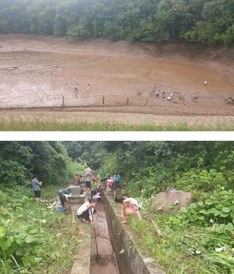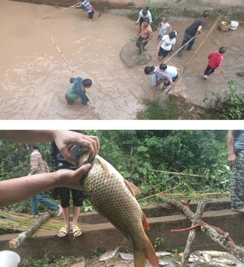 捞鱼时,老少村民们全寨出动,分工有序,提前扎好竹排放在泄洪道,在捞鱼的前一天就开闸放水。捞鱼当天,村民们有的在库底排泥,有的负责开闸,有的负责捞鱼,密切配合,现场忙碌又喜庆。