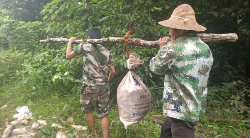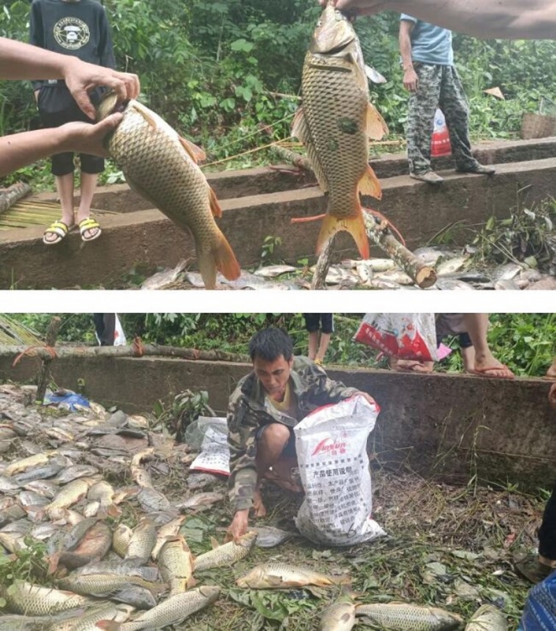 鲤鱼罗非鱼个体差不多大,总共77份,一份大概3条大鲤鱼、3条大罗非,有经验的村民们看一眼就知道哪堆多了哪堆少了,少了的再添上小一点一条鱼。最后挑几堆鱼出来过下秤,误差在几两之内,成了!按姓名来从坝埂一端开始领鱼,张家2份、李家4份……大家有的用口袋、有的用小桶、有的用背篓来领取自己的份子鱼,共享大丰收的喜悦。