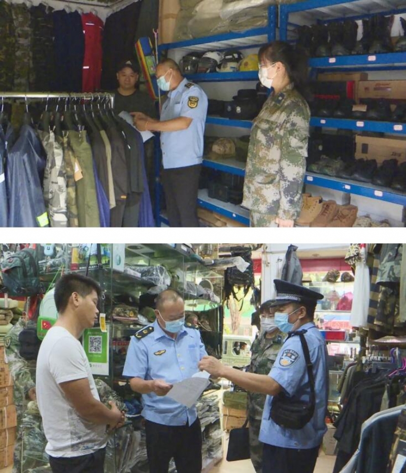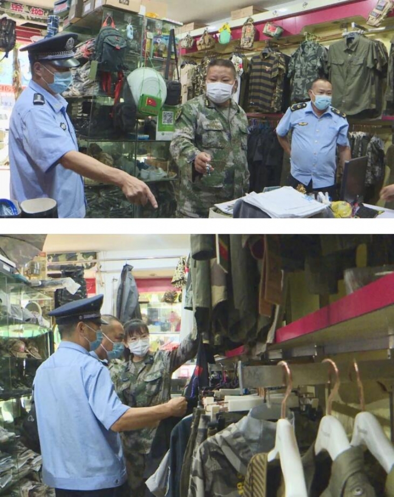 会后,深入多家劳保用品店对销售劳保用品和悬挂“军服”“军品”标识的店铺进行检查,并现场开展法律法规知识宣传,引导商家业主认识到违规销售和使用假冒军服危害性。对在检查中发现的违规销售的军品仿制品,现场要求其下架,现场整改。并提醒广大经营者,要提高军服法规意识,维护军服专用性和严肃性,群众也可检举揭发涉军服违法犯罪行为,共同守护戎装。