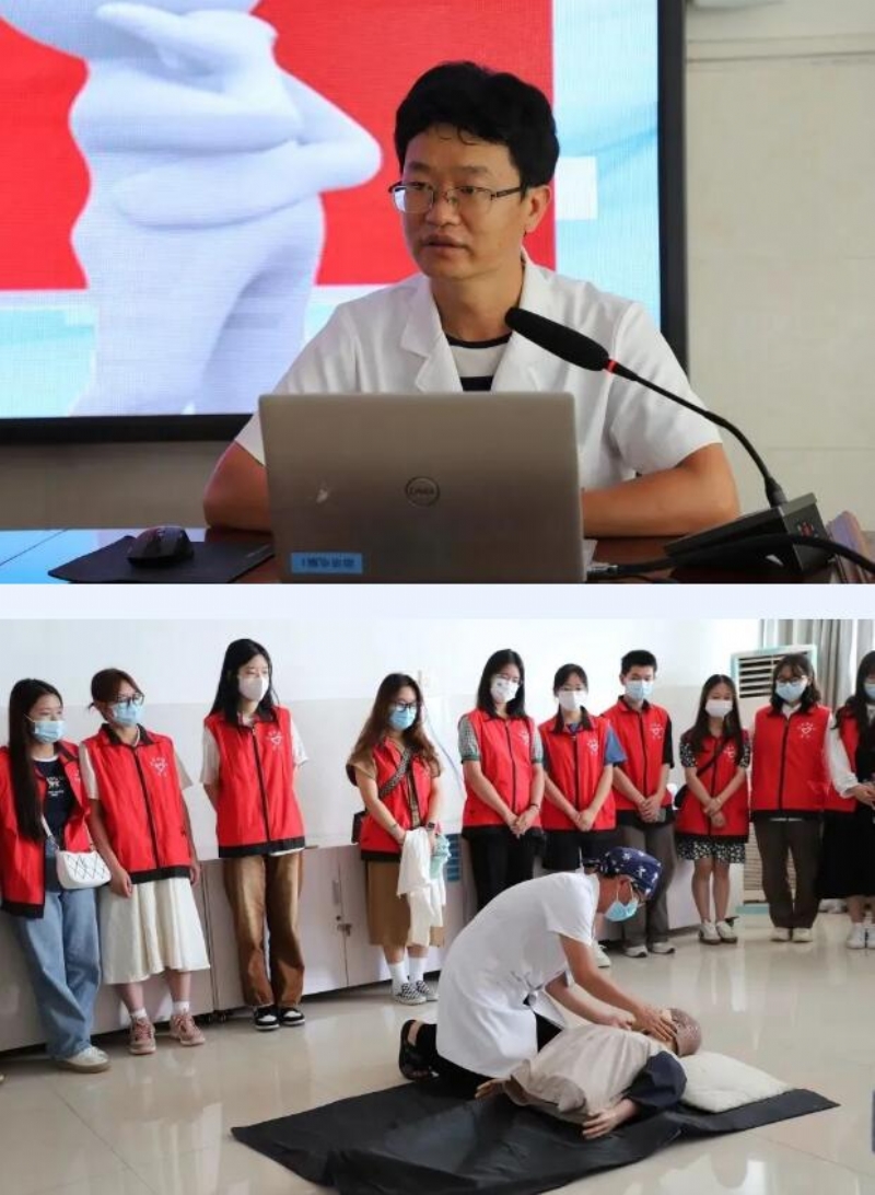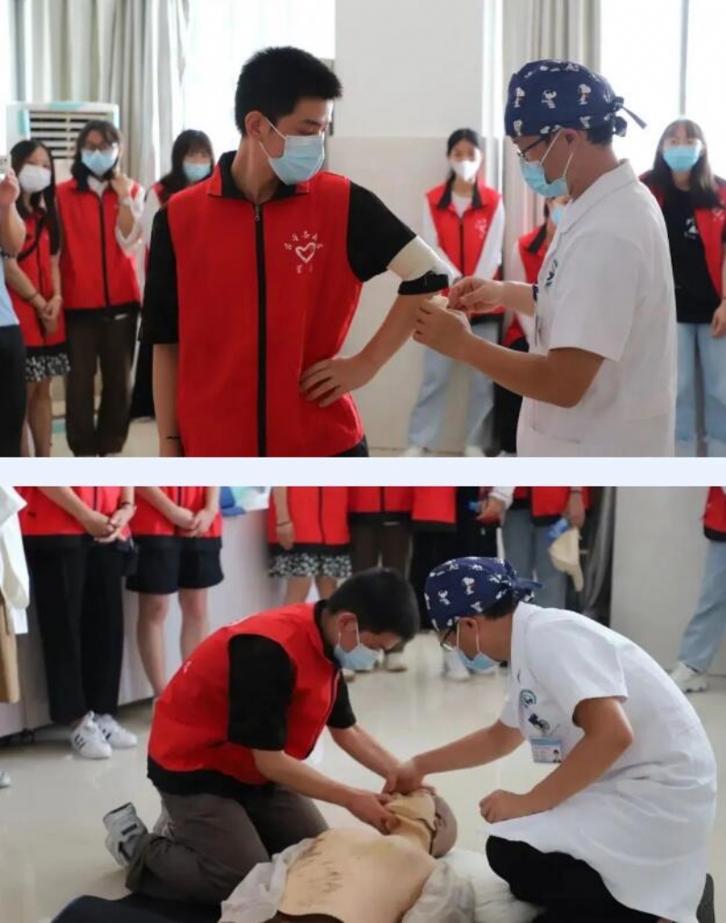 培训现场,骨与创伤科主治医师围绕意外事故发生后的急救程序、心肺复苏、创伤救护技能、气道异物梗阻等内容进行授课。在实操环节中,对心肺复苏术、包扎等技能手把手指导同学们正确地进行操作。