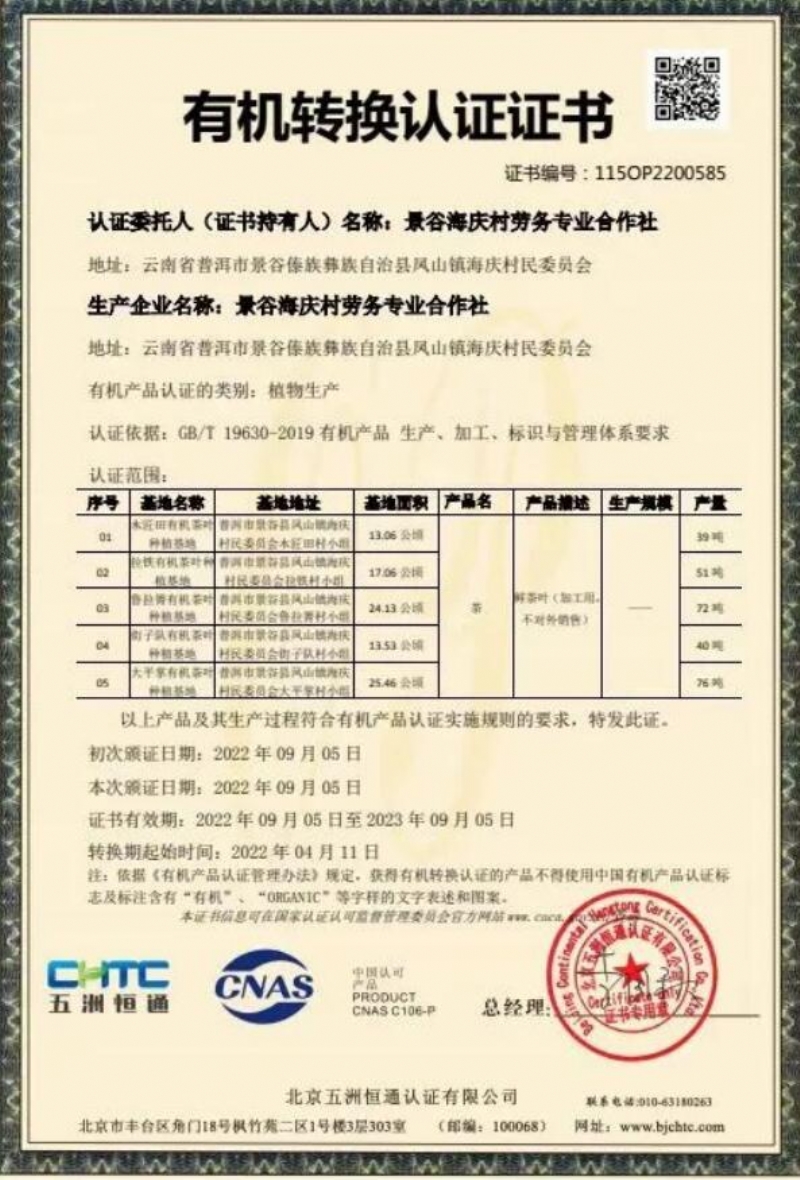 在云南省农业科学院的支持和帮扶下,9月9日,柏林村传来了好消息,“有机转换认证证书”已发到手,至此,全村6000亩茶园都已进入了有机转换期,为全村打造有机茶园打下了坚实的基础。据了解,目前凤山镇已初步实现柏林村6000亩、顺南村2882亩、文竹村2115亩、海庆村1399亩茶园有机认证全覆盖,全镇有机茶园认证占比达到51%的规模,茶产业发展迈上了新台阶,也为凤山镇茶产业振兴打下了坚实的基础。