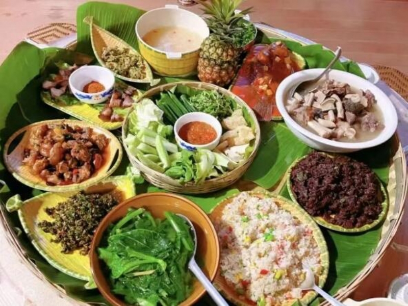 除了果干系列的开发,施天英还办起了农家乐,游客们不但可以体验摘菠萝,还可以享受美味的菠萝宴。一大早,施天英家的后厨就忙碌了起来,烤、蒸、煮、炸,一道道以菠萝有关的菜品是施天家厨房里的主角,不一会儿,客人们纷纷到来,享用菠萝宴,一道道美味佳肴让食客们赞不绝口。