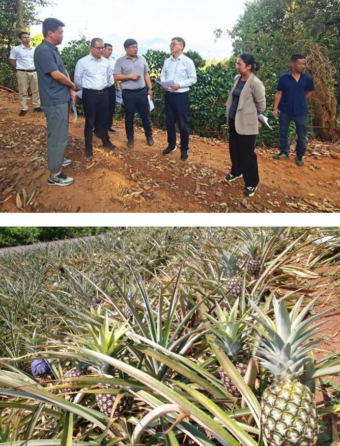 在凤山镇平寨村那肖田村民小组,张智勇深入菠萝种植基地,查看菠萝长势,了解菠萝产业发展情况。他强调,要持续创新培育菠萝市场体系,引进名优特品种,规范种植规模经营,拓宽流通渠道,严格把控品质,强化精深加工,加大科研开发力度,对接服务好市场,做大做强产业,增加果农收入,助推乡村振兴。
