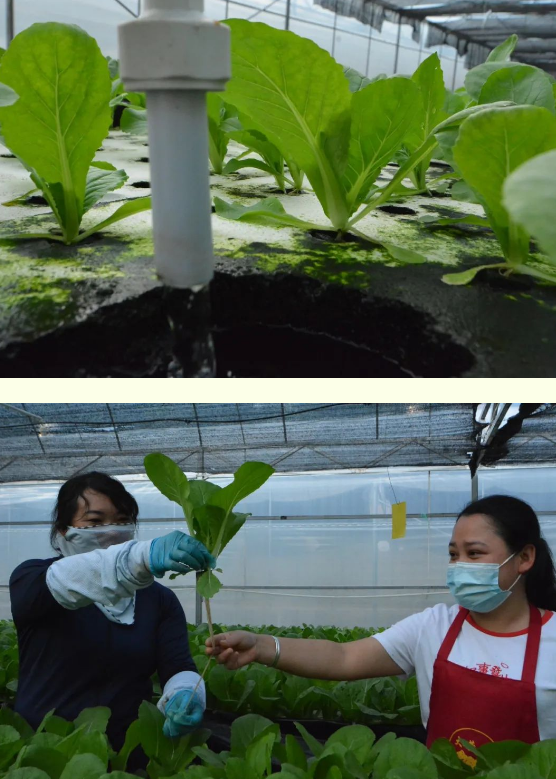 蔬菜离地也能长,全靠水里有营养。走进水培大棚,映入眼帘的是一片长势喜人的水培菜,在水循环系统的滋润下它们株株挺拔直立、叶片娇嫩欲滴,工人们正穿梭在水培池里忙着采收,准备运送到县城各大超市及农贸市场销售。