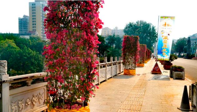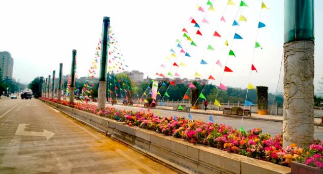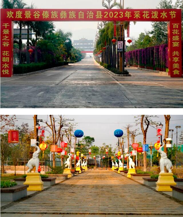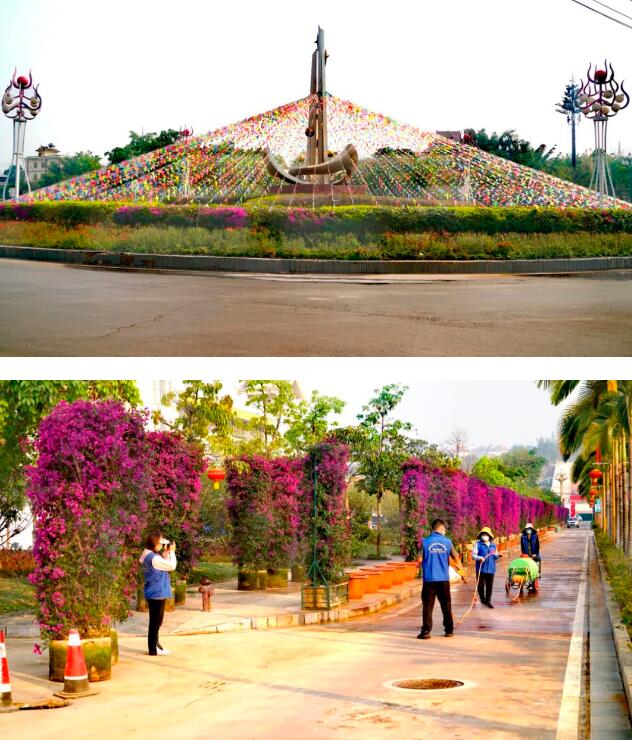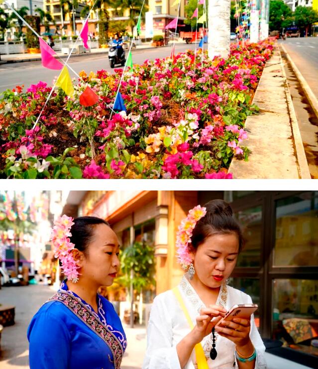 千景之谷·花朝水悦 2023年采花泼水节就要到了,景谷多措并举“扮靓”大街小巷,节日氛围感满满。县城各条大道的转盘上挂满了彩旗,在春风的吹拂下,摇曳生姿,浓浓的喜庆气氛扑面而来。在威远江大桥及本次泼水节主会场文体中心广场上,新摆放的各色鲜花色彩艳丽,形成了一道靓丽的风景线。