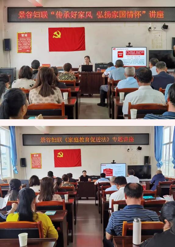 为进一步推进家庭家教家风在基层社会治理发挥重要作用,在“5·15国际家庭日”和全国第二个“家庭教育宣传周”到来之际,景谷各级妇联组织围绕《家庭教育促进法》《妇女权益保障法》《反家庭暴力法》《预防未成年人犯罪法》等保障妇女儿童权益的法律为主题,以中华优秀传统家风、红色家风、清廉家风为载体,下沉社区、乡村、进组入户,开展了形式多样的家庭教育普法活动,助推妇女儿童合法权益保障、家庭教育走入千家万户,生根发芽。 专题讲座,解答疑虑——巾帼宣讲暖人心 积极推进“巾帼大宣讲”,组织动员各级妇联干部及巾帼普法强基志愿宣讲团队,深入基层开展妇女儿童合法权益保障、家风家教宣教讲座,推进家庭教育“进机关、进企业、进学校、进村(社区)、进家庭”。巾帼宣讲员们结合“三访四察五送”中收集和反馈的问题和建议,认真准备课件和案例,通过身边一个个真实案例讲述优良家风、红色家风故事,铭记党史党恩,弘扬家国情怀,推动形成爱国爱家、相亲相爱、向上向善、共建共享的社会主义家庭文明新风尚,引导广大家长和群众进一步增强家风家教观念、妇女儿童法律观念和法治意识,创建和谐家庭氛围。