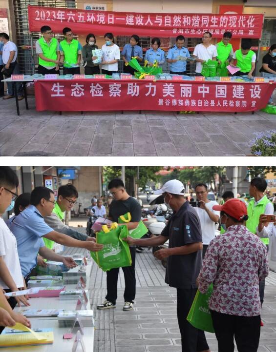 6月5日,景谷开展“建设人与自然和谐共生的现代化”2023年“六五”世界环境日主题宣传活动。普洱市生态环境局景谷分局联合县法院、检察院、农科、林草、应急、水务、文旅、威远镇等12个环委成员单位参加宣传活动。