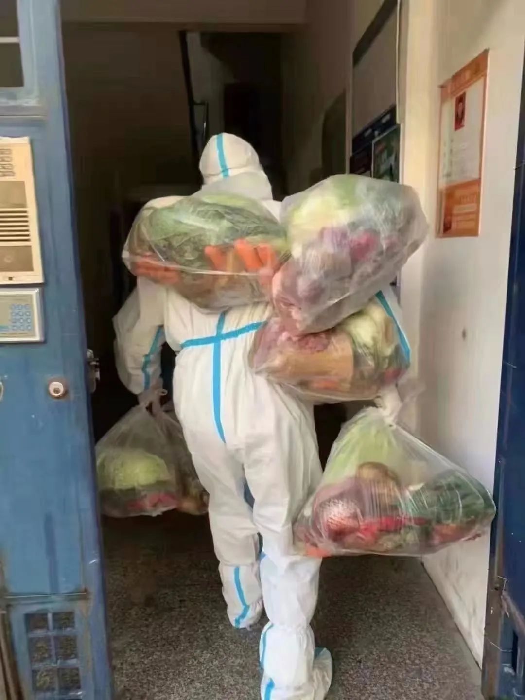 江西上饶的一位社区志愿者 浑身上下挂满蔬菜 给小区居民分发物资 略显佝偻的身躯 在我们眼中是那么伟岸