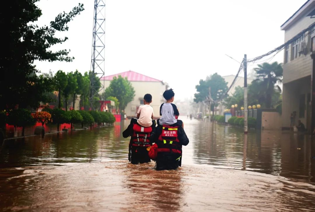 两名消防队员 驮着两个孩子 小心翼翼地蹚过齐腰深的积水 像极了父亲的背影