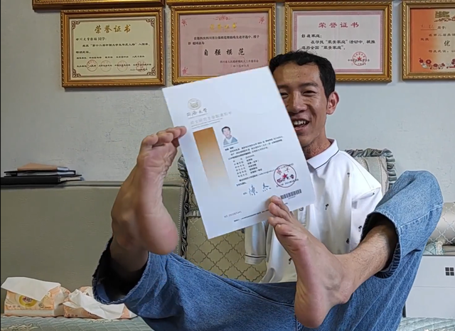7月,“无臂男孩”彭超 在四川老家 收到了心心念念的 同济大学研究生录取通知书 心底有梦,眼中有光 彭超用脚书写了热血人生