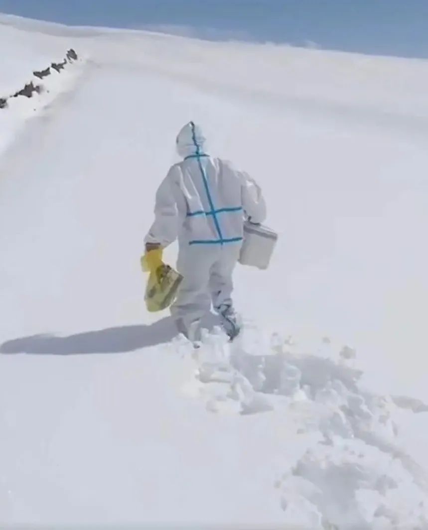 这是新疆乌恰县一名医护人员 冒着大雪 给护边员做核酸检测 在茫茫雪地中趟出一条路 孤寂的背影令人动容
