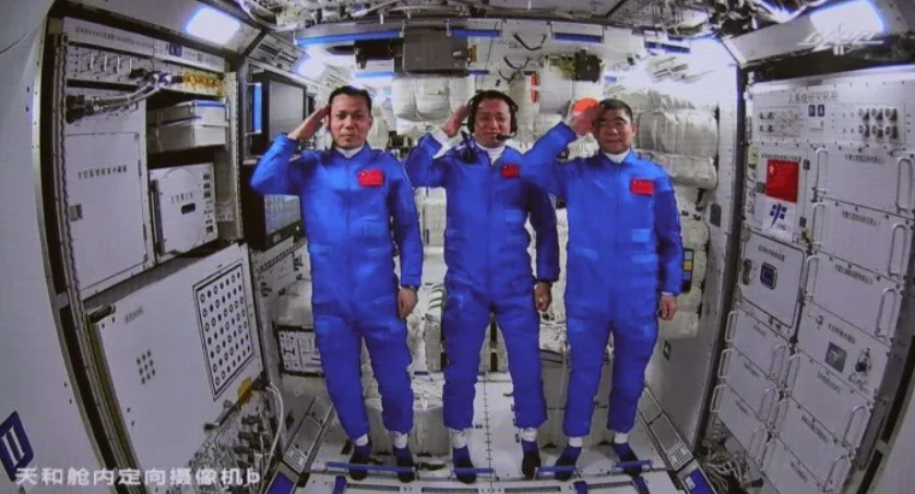 还有这幅 神舟十二号乘组 在中国空间站天和核心舱 向祖国人民敬礼的画面 中国人首次进入了自己的空间站 亲眼见证这一历史性时刻 怎能不令人热血沸腾