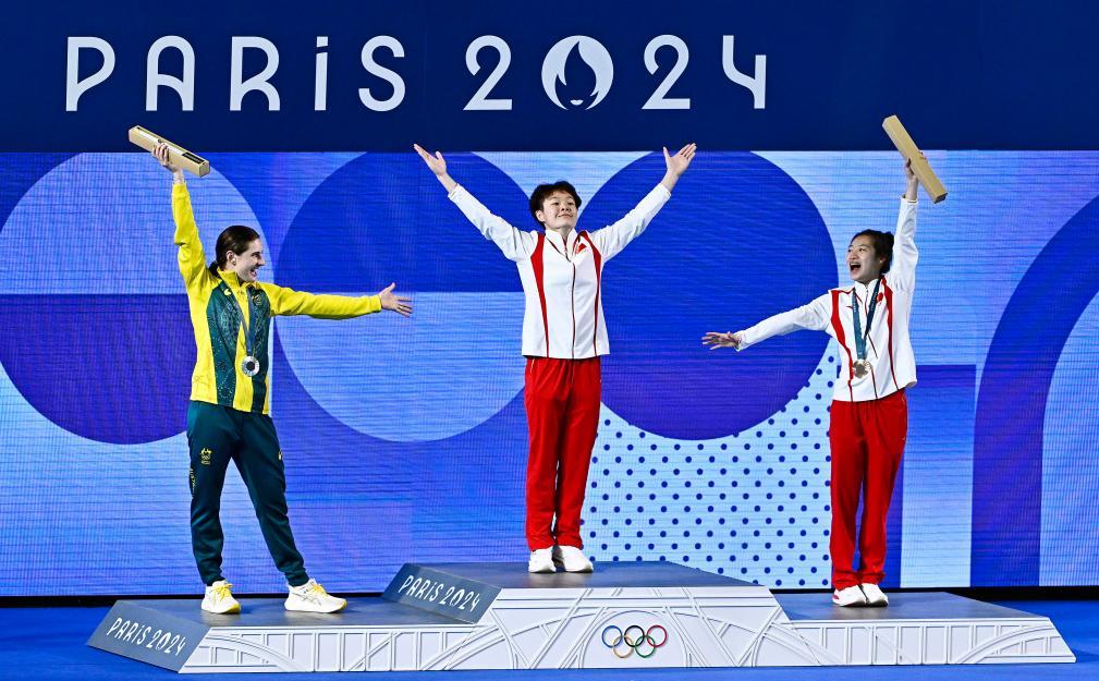△在巴黎奥运会跳水项目女子3米板决赛中,中国选手陈艺文获得金牌,中国选手昌雅妮获得铜牌。 习近平总书记指出:“中国体育代表团的优异成绩,既是我国体育事业发展进步的集中体现,也是中国式现代化建设成就的一个缩影,充分彰显了新时代中国力量。”“我国能够跻身世界体育大国、奥运强国之列,根本在于综合国力不断增强,为体育竞技训练提供了先进科技支撑和坚实物质保障,也为各领域体育人才脱颖而出创造了良好成长环境和广泛群众基础。”