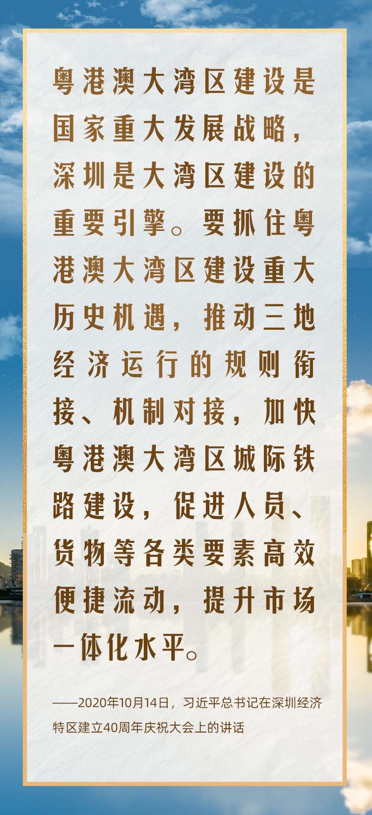 2023年4月,习近平总书记在视察广东时指出,要使粤港澳大湾区成为新发展格局的战略支点、高质量发展的示范地、中国式现代化的引领地。目前,深圳正把握粤港澳大湾区建设的大机遇、大文章。2024年,深中通道的正式通车缩短了湾区城市的距离;深圳和香港实现公交、地铁“一码畅行”,加速深港交通一体化的进程,优化双城出行体验,为构建“1小时优质生活圈”创造良好环境。深圳正坚定不移全面深化改革、扩大高水平对外开放,切实建设好中国特色社会主义先行示范区,努力在粤港澳大湾区建设中展现更大作为。