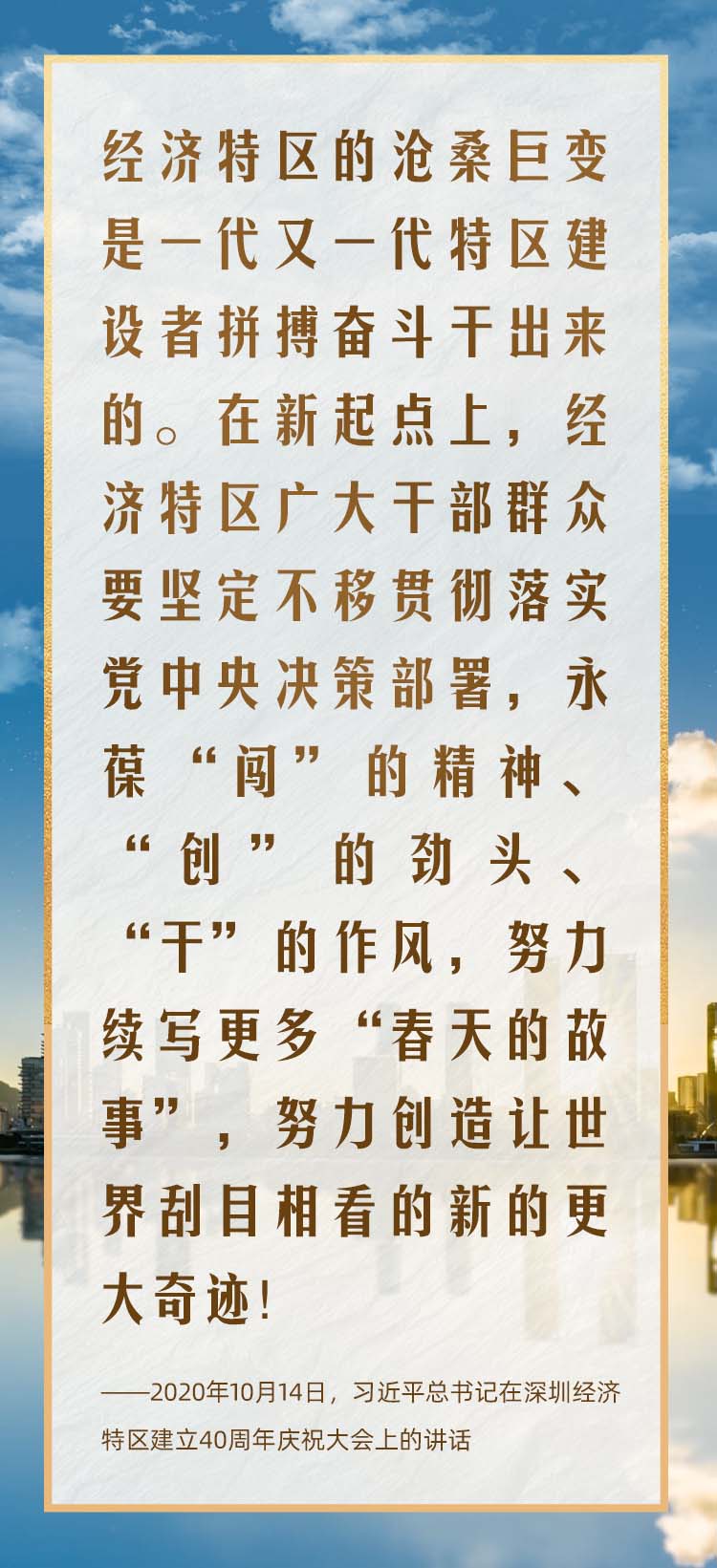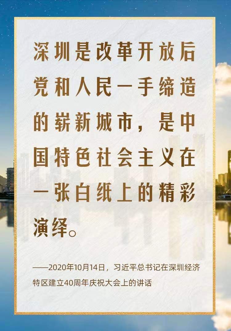 2012年12月,党的十八大后首次离京视察,习近平总书记就来到这里,发出“将改革开放继续推向前进”的动员令。 2018年10月,在庆祝改革开放40周年之际,习近平总书记再次来到这里,号召“继续全面深化改革、全面扩大开放,努力创造出令世界刮目相看的新的更大奇迹”。 2020年10月,在庆祝深圳经济特区建立40周年之际,习近平总书记又一次来到这里,出席庆祝大会,强调改革不停顿、开放不止步,在更高起点上推进改革开放,推动经济特区工作开创新局面。 经济特区是我国改革开放的重要产物,深圳是党和人民一手缔造的崭新城市。44载深圳建设史,也是中国波澜壮阔的改革开放史。2024年上半年外贸进出口2.2万亿元、居民人均可支配收入达 42107元,2023年深圳地区生产总值34606.40亿元……一组组数字的背后是一座现代化新城在快速崛起。