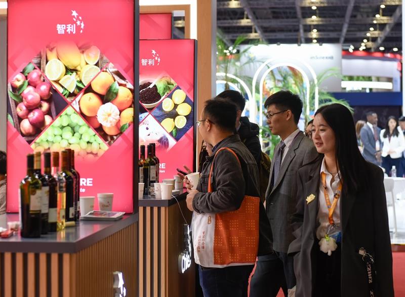 △2024年11月7日,观众在第七届进博会国家展上的智利馆了解智利红酒。 以诚相交 相互支持 “‘海内存知己,天涯若比邻。’用这句中国古诗来形容中巴关系再贴切不过了。”2014年7月,习近平主席在巴西国会的演讲中说道。 今年是中巴两国建交50周年。由中巴双方共同设计的纪念标识中,数字“5”和“0”相融相交,构成无穷符号(∞),寓意中巴虽相隔万里却紧密相连、命运与共。