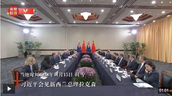 △会见现场的中智两国国旗。(总台央视记者耿小龙拍摄) 中国同新西兰的关系长期“领跑”中国同发达国家关系。习主席曾多次强调,双方要发扬“争先”精神。 会见新西兰总理拉克森时,习主席说,中方愿同新方一道,继续发扬“争先”精神,共同打造相互尊重、彼此包容、聚焦合作、共同发展的中新关系。 △独家视频丨习近平会见新西兰总理拉克森 在同6国领导人会见时,习近平主席强调,要加强国际和地区事务协作,推动构建亚太命运共同体。外方领导人表示,愿同中方在亚太经合组织等框架内密切合作。 跨越山海,携手并肩,浩瀚的太平洋就能变为促进繁荣增长的通途。《时政新闻眼》将持续为你关注习主席拉美之行。