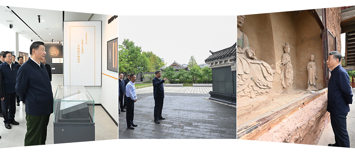 △ 2024年9月10日,习近平总书记在前往甘肃考察途中,来到陕西宝鸡参观宝鸡青铜器博物院。 何尊铭文有“宅兹中国”一词,这是迄今为止“中国”一词的最早文字记录。 “当时的‘中国’,是一个地理概念吧?”总书记问道。 “确是指地理方位。‘中’如旌旗,意指中心、中央。‘国’是会意字,城池壕沟、执戈守护。”讲解员回答。 总书记感慨:“中华文明五千年,还要进一步挖掘,深入研究、阐释它的内涵和精神,宣传好其中蕴含的伟大智慧。” 器以藏礼,字以弘文。方寸之间,一览千年。 所谓“何以中国”,即用考古等方式,追寻中华民族和中华文明“多元一体、持续发展”的历程。 “麦积山石窟‘东方微笑’”跨越千年,六尺巷礼让家风代代相传。天津古文化街人潮熙攘……” 过去一年,习近平总书记一次次探寻历史,在凝望中感悟“何以中国”。 在湖北孝感云梦县博物馆,他逐字逐句读出“最早家书”,从历史深处感受中华文明的深厚积淀。 沿安徽桐城古城内的六尺巷缓缓步行,他于“懿德流芳”的牌坊和诗书照壁前凝望“融入到中国人的基因中”的精神与美德。 在甘肃天水麦积山石窟,他仔细察看历经十余王朝的雕塑、壁画,凝望“历经沧桑留下的最宝贵的东西”。 …………