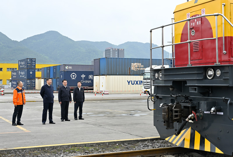 △ 2024年5月22日,习近平总书记在山东日照港考察。 改革开放后,日照港迅速成长为“最年轻”的5亿吨级港口、全球首个顺岸开放式全自动化集装箱码头,年货物吞吐量居世界第七位,被总书记称赞为“改革开放的排头兵”。 “从中,我们应当坚定一种信念,中国的改革开放之路一定可以成功。”总书记语气坚定。 2024年,总书记还走进了重庆对外开放的“地标”——重庆国际物流枢纽园区。 今日中国,“四向”物流通道在重庆交汇。向西,中欧班列直抵欧洲;向北,“渝满俄”铁路纵贯南北;向东,长江黄金水道联通中部地区和长三角;向南,西部陆海新通道跨山越海。 国内市场与国际市场、中国经济和世界经济在这里深度融合。在园区内的重庆铁路集装箱中心站,总书记在一辆列车前驻足凝望。