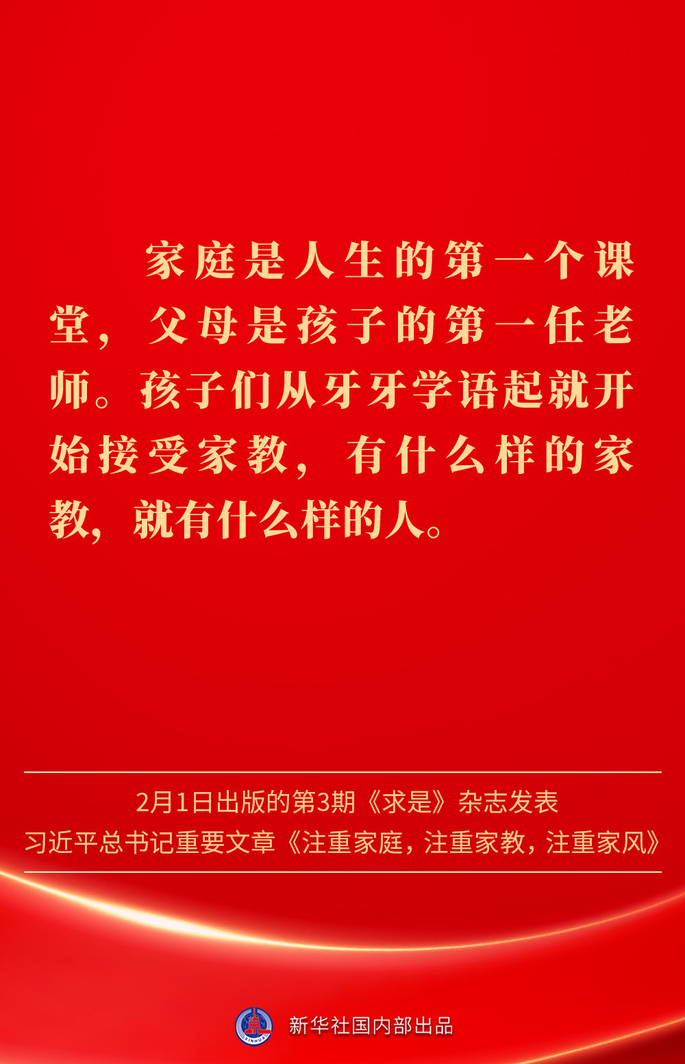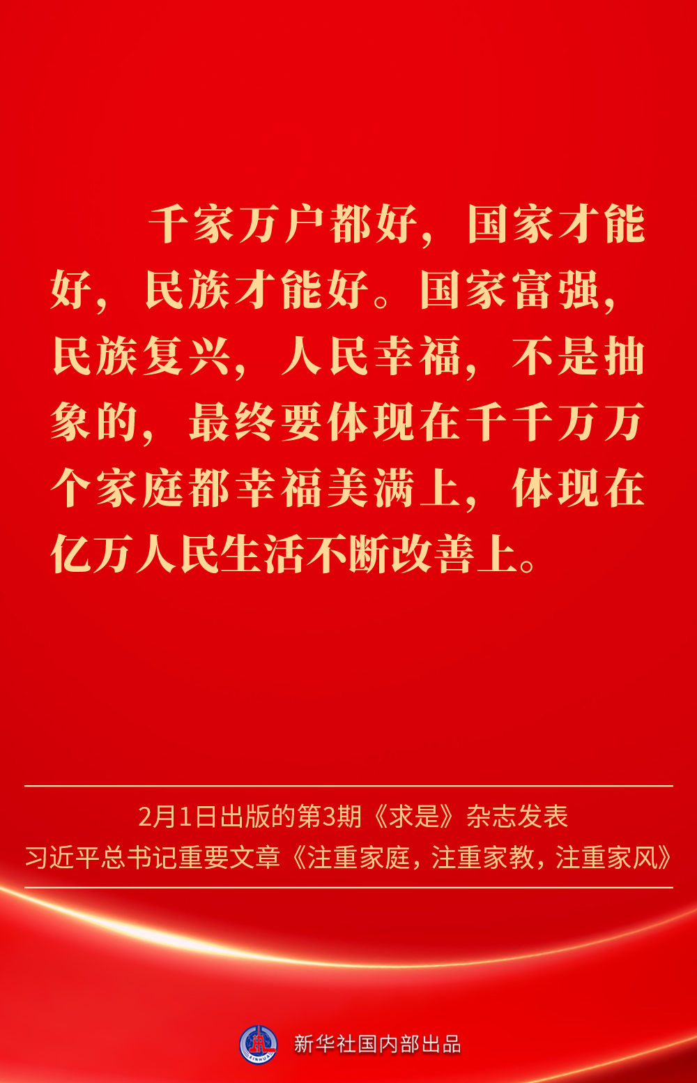 万家团圆共庆新春佳节之际,2月1日出版的第3期《求是》杂志发表习近平总书记重要文章《注重家庭,注重家教,注重家风》。为什么要注重家庭、家教、家风?如何做好家庭文明建设?习近平总书记这样阐述——