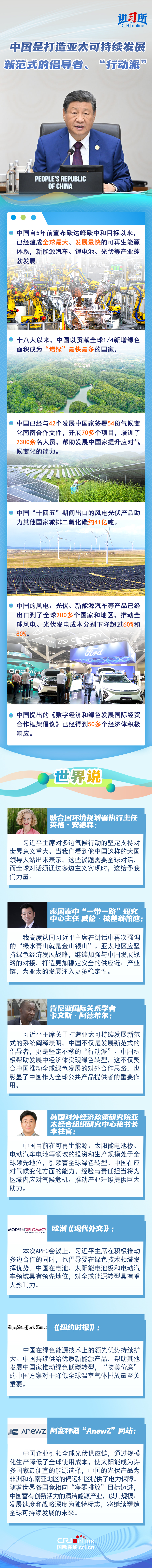 【本期导读】 “我们要本着对子孙后代负责的态度,加强各经济体绿色发展战略对接,促进优质绿色技术和产品自由流通,加快推动发展方式绿色低碳转型,积极应对气候变化。”11月1日,中国国家主席习近平在亚太经合组织第三十二次领导人非正式会议第二阶段会议讲话中提出,要坚持绿色低碳,打造亚太可持续发展新范式。 国际社会认为,中国不仅是打造亚太可持续发展新范式的倡导者,更是坚定不移的“行动派”,亚太地区应坚持绿色经济发展战略,继续加强与中国发展战略的对接,打造更加稳定安全的供应链、产业链,为亚太的发展注入更多稳定性。
