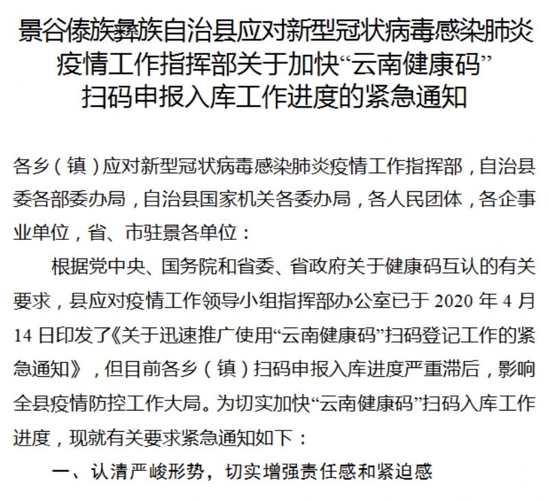 景谷傣族彝族自治县应对新型冠状病毒感染肺炎疫情工作指挥部关于加快“云南健康码”扫码申报入库工作进度的紧急通知 下一篇: 2020年关于加强森林草原防火工作的通告 |
