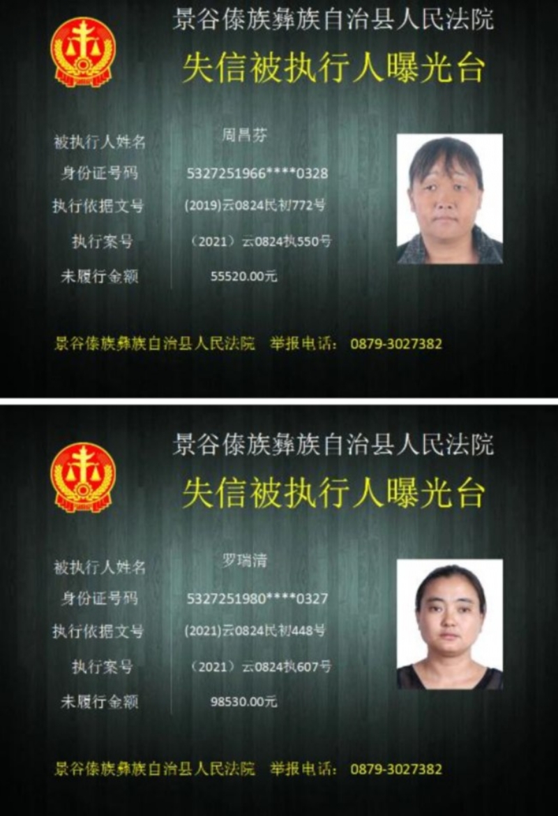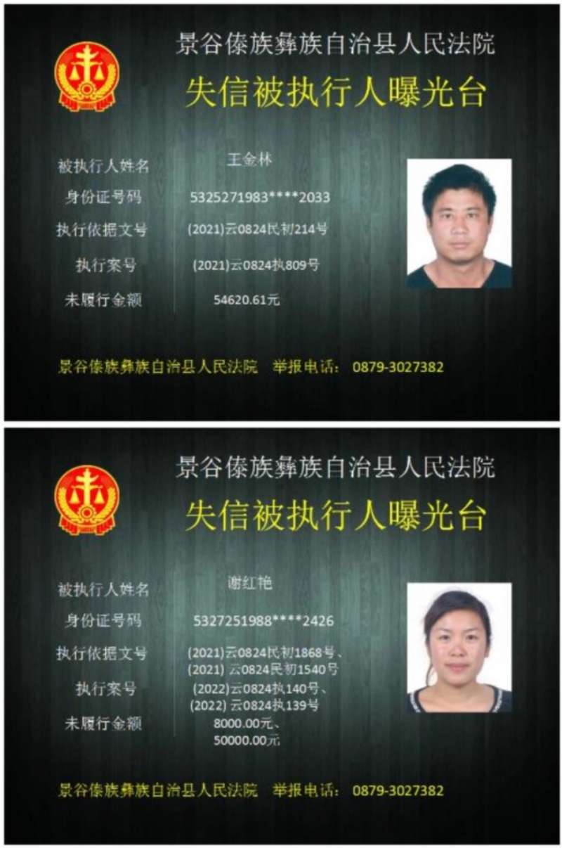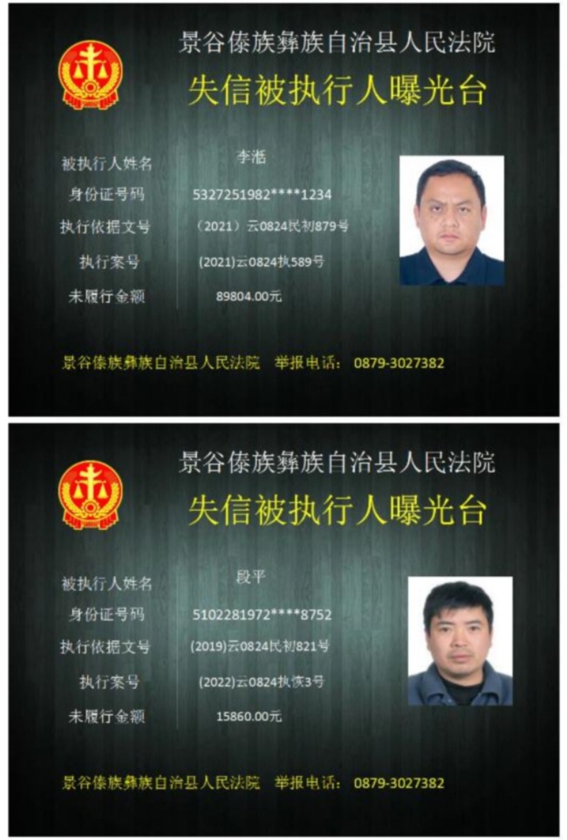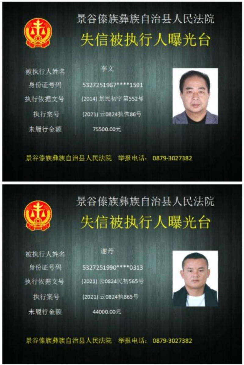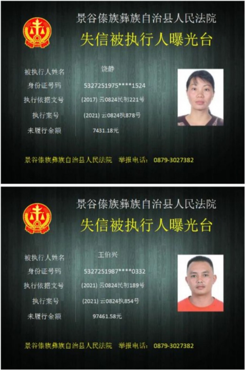 列入失信被执行人名单库的,政府相关部门、金融监管机构、金融机构、承担行政职能的事业单位及行业协会等相关单位依照法律、法规和有关规定,在政府采购、招标投标、行政审批、政府扶持、融资信贷、市场准入、资质认定等方面,对失信被执行人予以信用惩戒,征信机构在其征信系统中记录。国家工作人员、人大代表、政协委员等被纳入失信被执行人名单的,人民法院将失信情况通报其所在单位和相关部门。国家机关、事业单位、国有企业等被纳入失信被执行人名单的,人民法院将失信情况通报其上级单位、主管部门或者履行出资人职责的机构。 被执行人为自然人的,被采取限制消费措施后,不得有以下高消费及非生活和工作必需的消费行为:(一)乘坐交通工具时,选择飞机、列车软卧、轮船二等以上舱位;(二)在星级以上宾馆、酒店、夜总会、高尔夫球场等场所进行高消费;(三)购买不动产或者新建、扩建、高档装修房屋;(四)租赁高档写字楼、宾馆、公寓等场所办公;(五)购买非经营必需车辆;(六)旅游、度假;(七)子女就读高收费私立学校;(八)支付高额保费购买保险理财产品;(九)乘坐G字头动车组列车全部座位、其他动车组列车一等以上座位等其他非生活和工作必需的消费行为。被执行人为单位的,被采取限制消费措施后,被执行人及其法定代表人、主要负责人、影响债务履行的直接责任人员、实际控制人不得实施上述规定的行为。 失信被执行人如能主动到景谷县人民法院履行义务的,本院将其有关信息从失信被执行人名单库中予以删除,并解除限制消费令。 敬请广大人民群众给予监督,如知道以上失信被执行人违反上述规定的请给予举报;如发现失信被执行人财产线索的,请将线索提供给景谷县人民法院。联系电话:0879-3027382、0879-3067853。