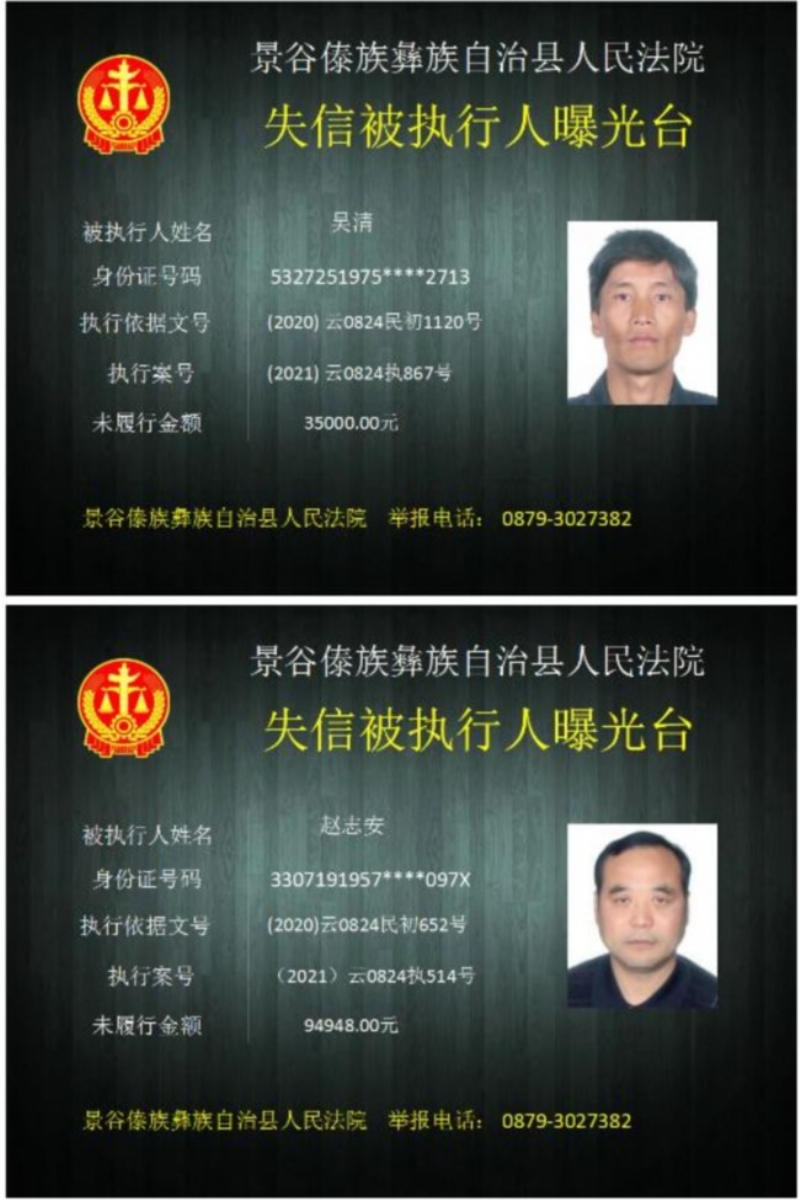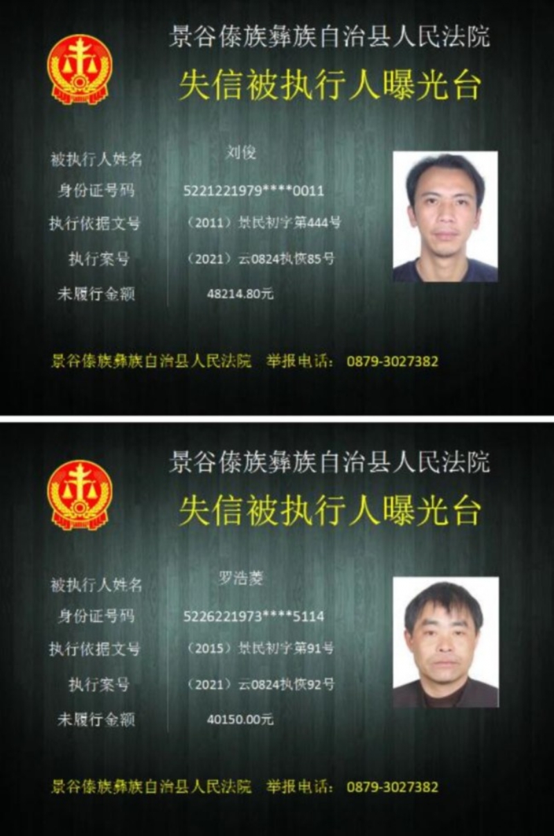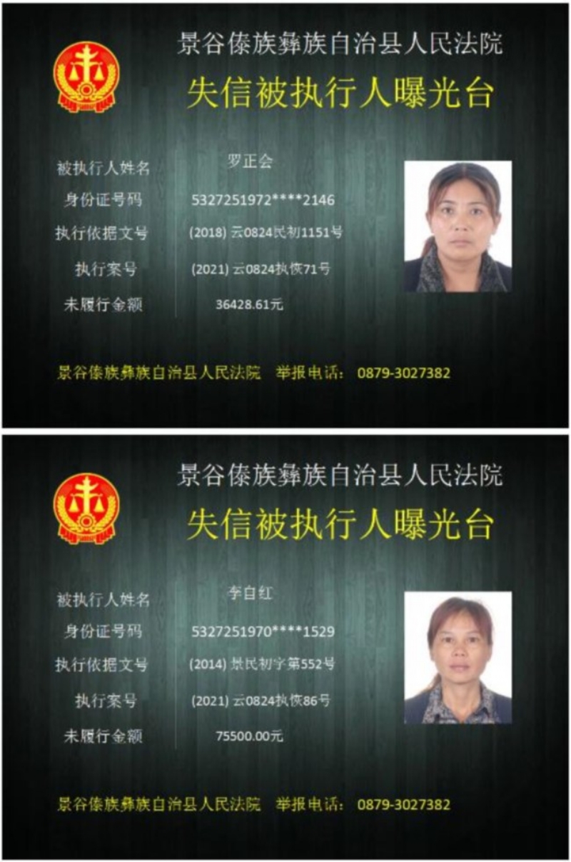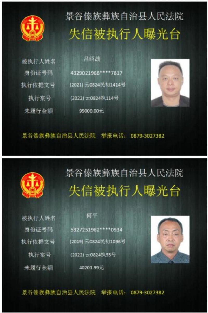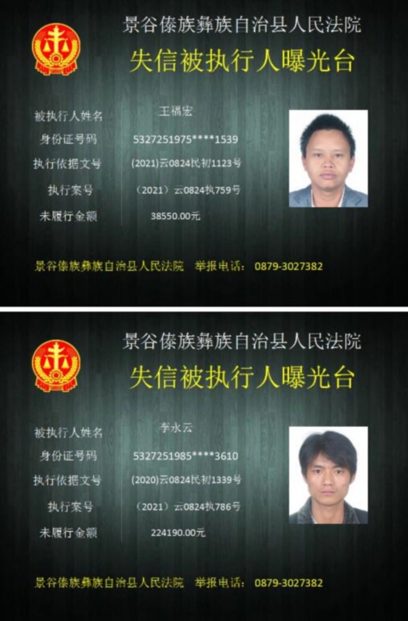 列入失信被执行人名单库的,政府相关部门、金融监管机构、金融机构、承担行政职能的事业单位及行业协会等相关单位依照法律、法规和有关规定,在政府采购、招标投标、行政审批、政府扶持、融资信贷、市场准入、资质认定等方面,对失信被执行人予以信用惩戒,征信机构在其征信系统中记录。国家工作人员、人大代表、政协委员等被纳入失信被执行人名单的,人民法院将失信情况通报其所在单位和相关部门。国家机关、事业单位、国有企业等被纳入失信被执行人名单的,人民法院将失信情况通报其上级单位、主管部门或者履行出资人职责的机构。 被执行人为自然人的,被采取限制消费措施后,不得有以下高消费及非生活和工作必需的消费行为:(一)乘坐交通工具时,选择飞机、列车软卧、轮船二等以上舱位;(二)在星级以上宾馆、酒店、夜总会、高尔夫球场等场所进行高消费;(三)购买不动产或者新建、扩建、高档装修房屋;(四)租赁高档写字楼、宾馆、公寓等场所办公;(五)购买非经营必需车辆;(六)旅游、度假;(七)子女就读高收费私立学校;(八)支付高额保费购买保险理财产品;(九)乘坐G字头动车组列车全部座位、其他动车组列车一等以上座位等其他非生活和工作必需的消费行为。被执行人为单位的,被采取限制消费措施后,被执行人及其法定代表人、主要负责人、影响债务履行的直接责任人员、实际控制人不得实施上述规定的行为。 失信被执行人如能主动到景谷县人民法院履行义务的,本院将其有关信息从失信被执行人名单库中予以删除,并解除限制消费令。 敬请广大人民群众给予监督,如知道以上失信被执行人违反上述规定的请给予举报;如发现失信被执行人财产线索的,请将线索提供给景谷县人民法院。联系电话:0879-3027382、0879-3067853。