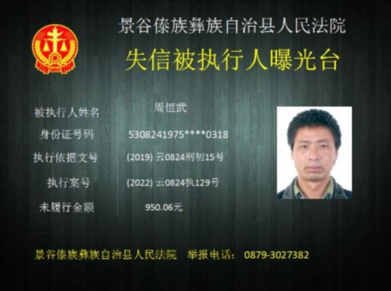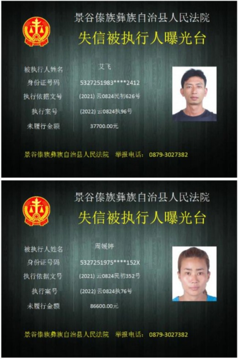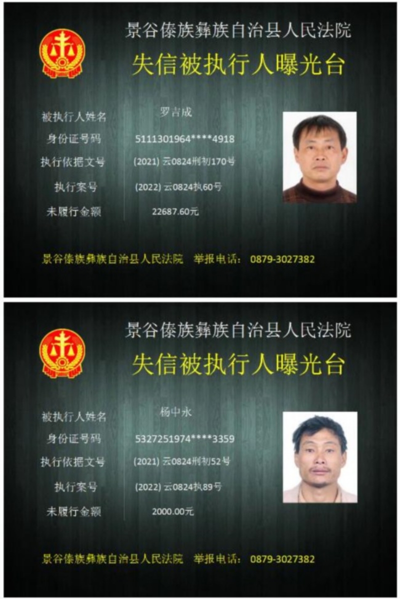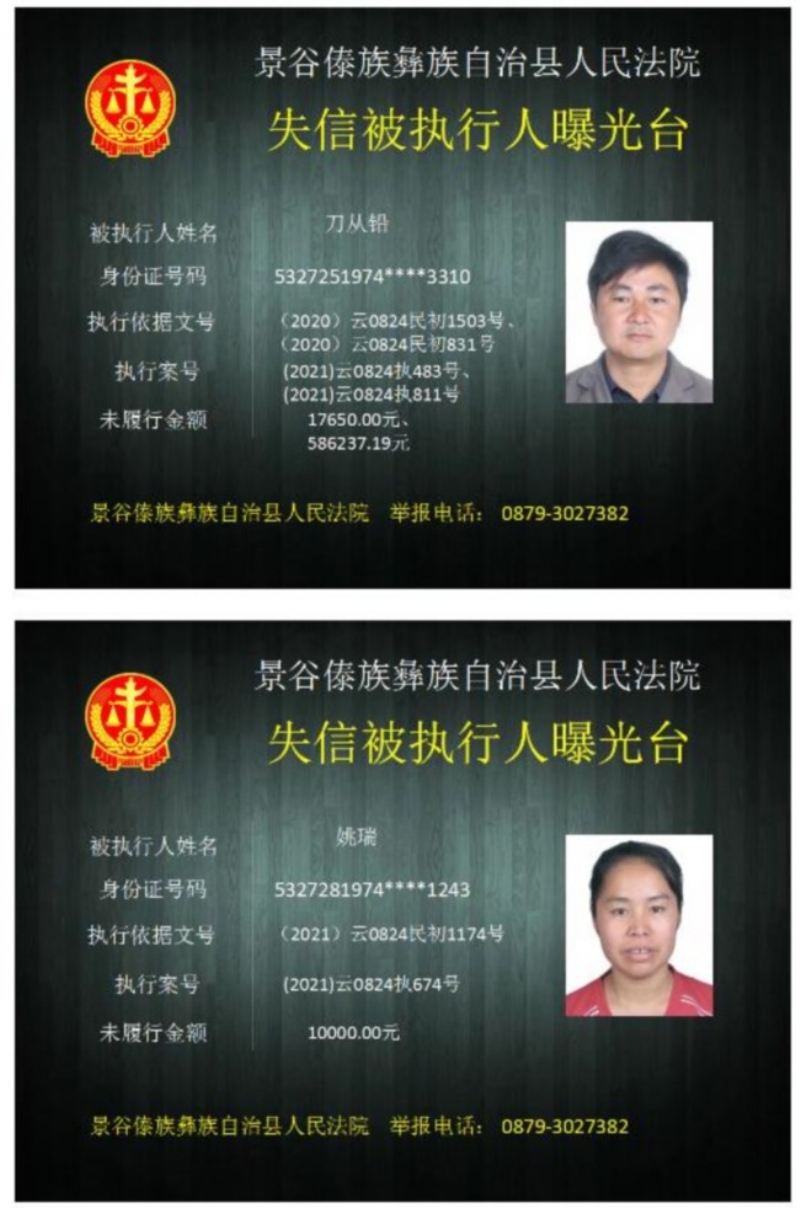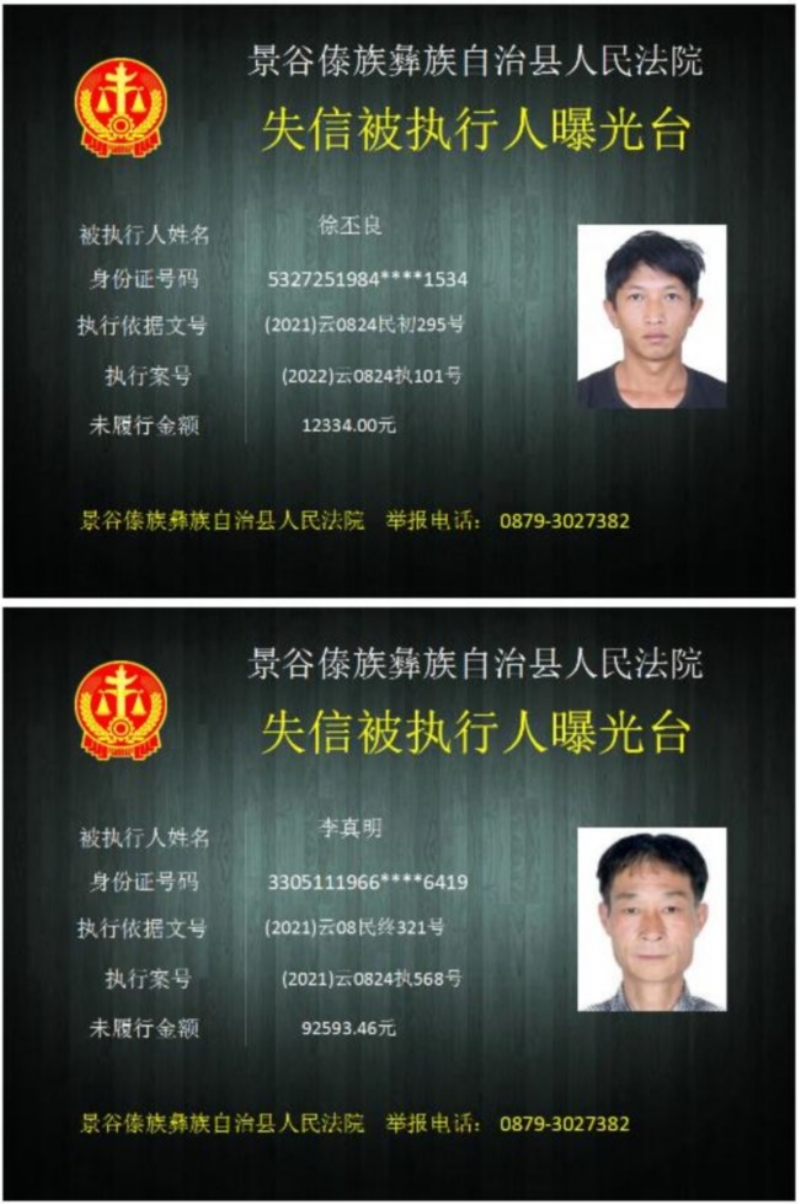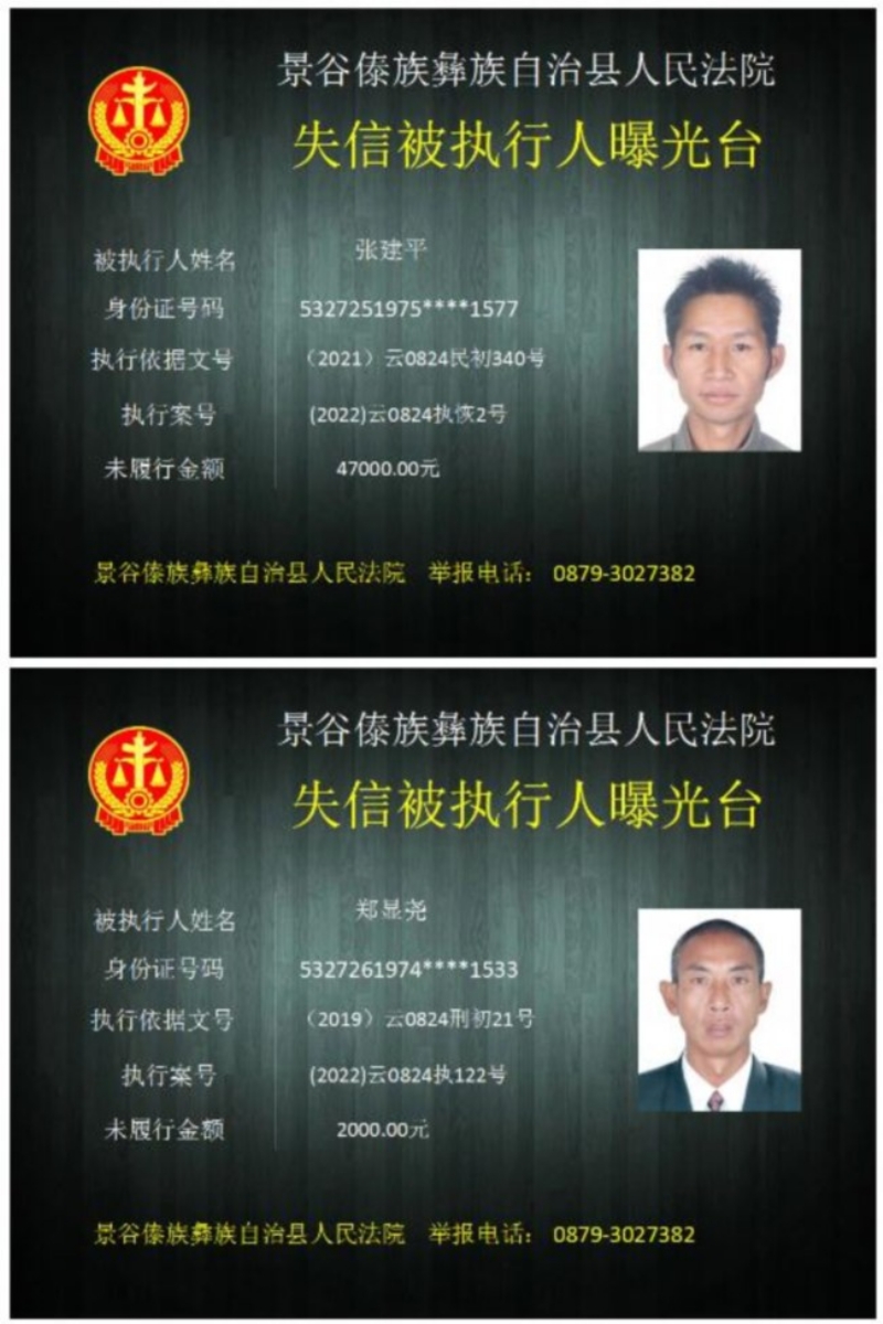 列入失信被执行人名单库的,政府相关部门、金融监管机构、金融机构、承担行政职能的事业单位及行业协会等相关单位依照法律、法规和有关规定,在政府采购、招标投标、行政审批、政府扶持、融资信贷、市场准入、资质认定等方面,对失信被执行人予以信用惩戒,征信机构在其征信系统中记录。国家工作人员、人大代表、政协委员等被纳入失信被执行人名单的,人民法院将失信情况通报其所在单位和相关部门。国家机关、事业单位、国有企业等被纳入失信被执行人名单的,人民法院将失信情况通报其上级单位、主管部门或者履行出资人职责的机构。 被执行人为自然人的,被采取限制消费措施后,不得有以下高消费及非生活和工作必需的消费行为:(一)乘坐交通工具时,选择飞机、列车软卧、轮船二等以上舱位;(二)在星级以上宾馆、酒店、夜总会、高尔夫球场等场所进行高消费;(三)购买不动产或者新建、扩建、高档装修房屋;(四)租赁高档写字楼、宾馆、公寓等场所办公;(五)购买非经营必需车辆;(六)旅游、度假;(七)子女就读高收费私立学校;(八)支付高额保费购买保险理财产品;(九)乘坐G字头动车组列车全部座位、其他动车组列车一等以上座位等其他非生活和工作必需的消费行为。被执行人为单位的,被采取限制消费措施后,被执行人及其法定代表人、主要负责人、影响债务履行的直接责任人员、实际控制人不得实施上述规定的行为。 失信被执行人如能主动到景谷县人民法院履行义务的,本院将其有关信息从失信被执行人名单库中予以删除,并解除限制消费令。 敬请广大人民群众给予监督,如知道以上失信被执行人违反上述规定的请给予举报;如发现失信被执行人财产线索的,请将线索提供给景谷县人民法院。联系电话:0879-3027382、0879-3067853。