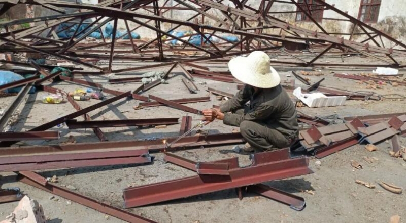 在原刨花板厂拆除现场,施工人员对老旧闲置厂房进行拆除,对可再利用的建材进行回收,目前已完成3000多平方米旧厂房拆除工作。